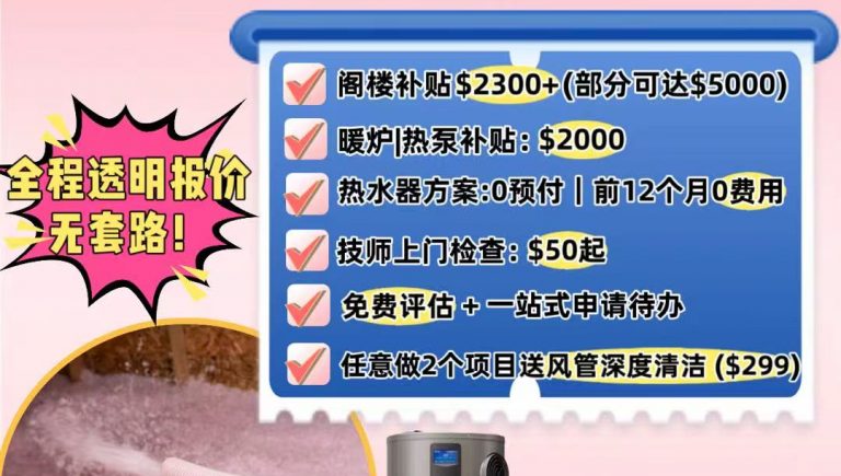 $2300+ 阁楼保温棉补贴 + $2000 暖炉/热泵补贴